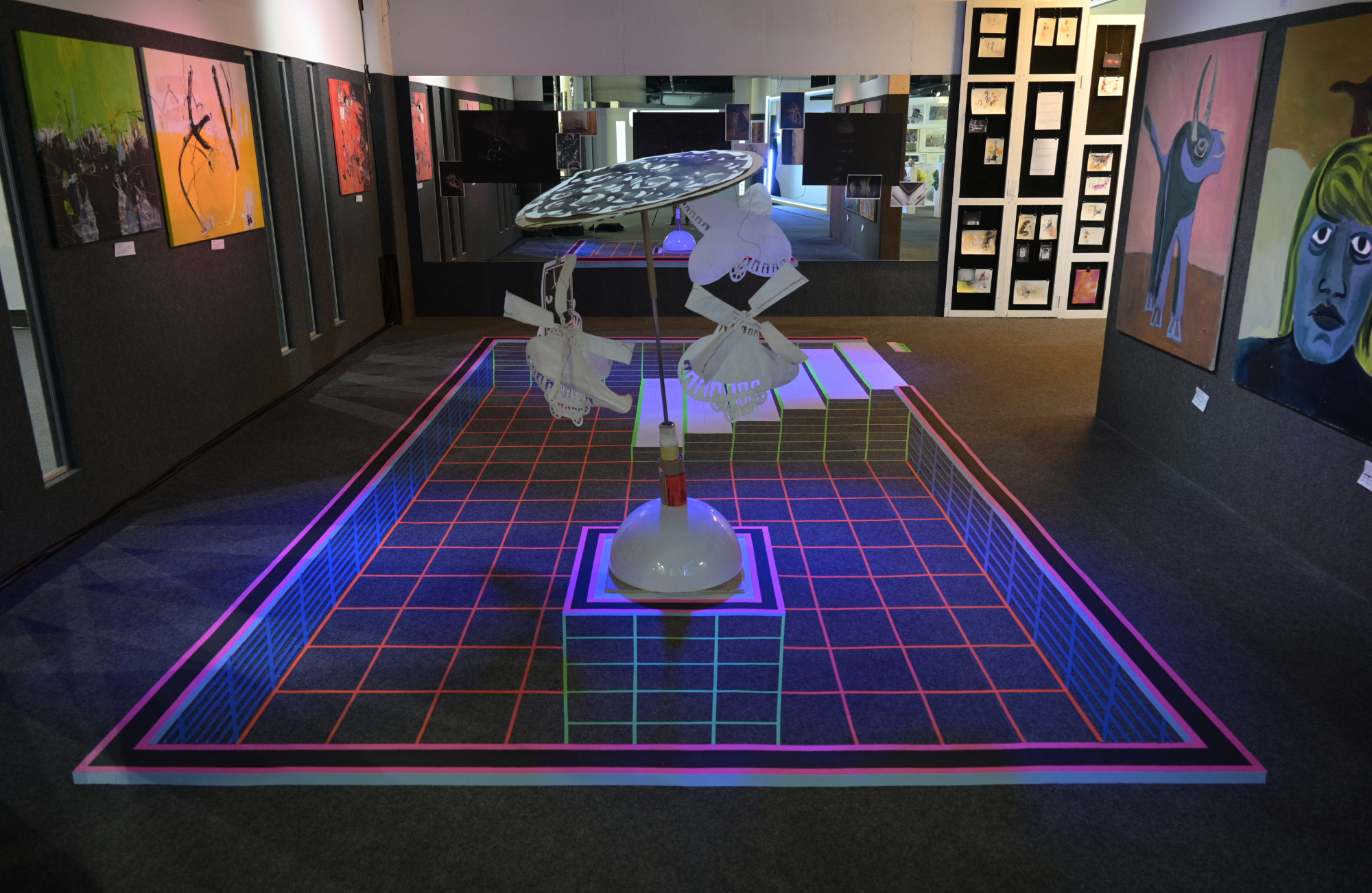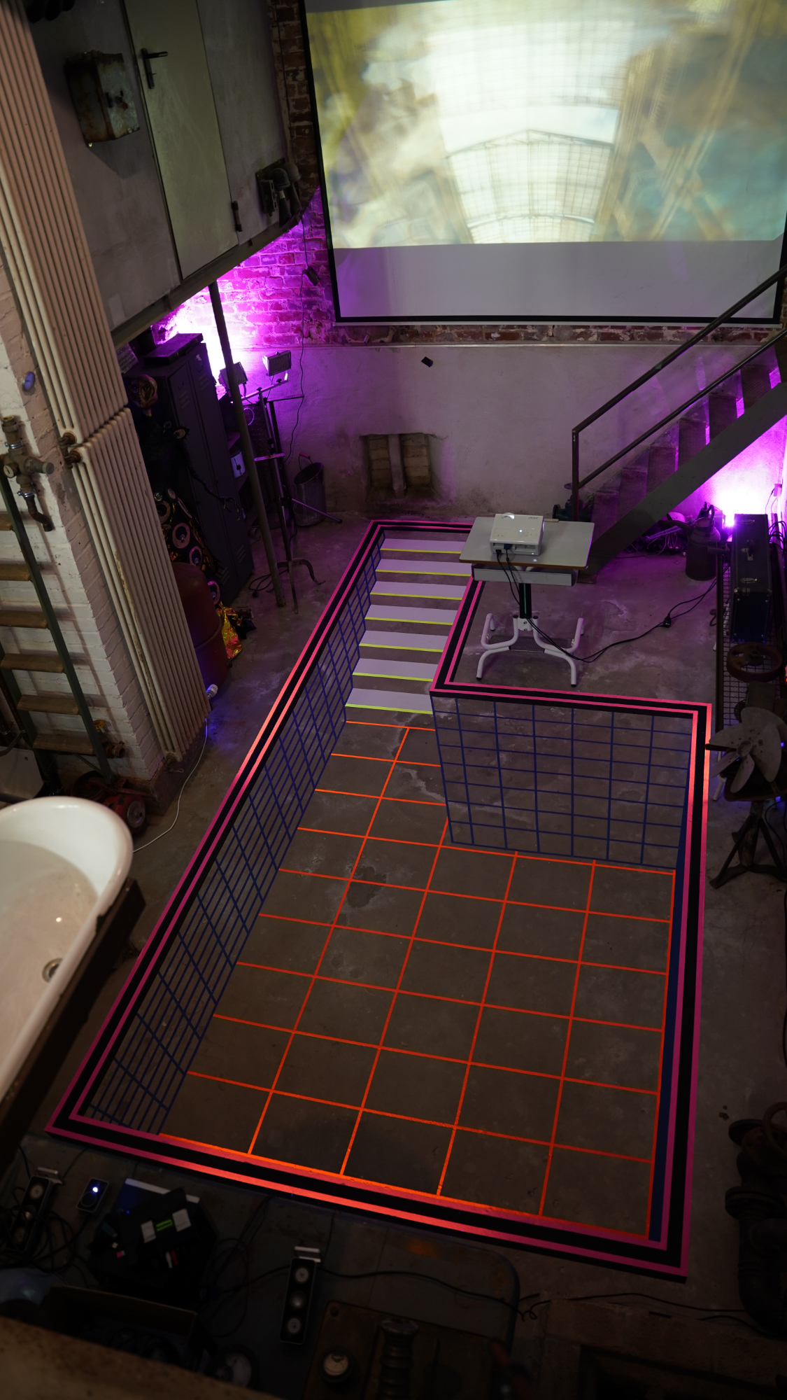 Becken, 2024 In Situ Arbeit in der Factory Tapes und Schwarzlicht mit der Skulptur "Karussell" von Renate Hausenblas |
