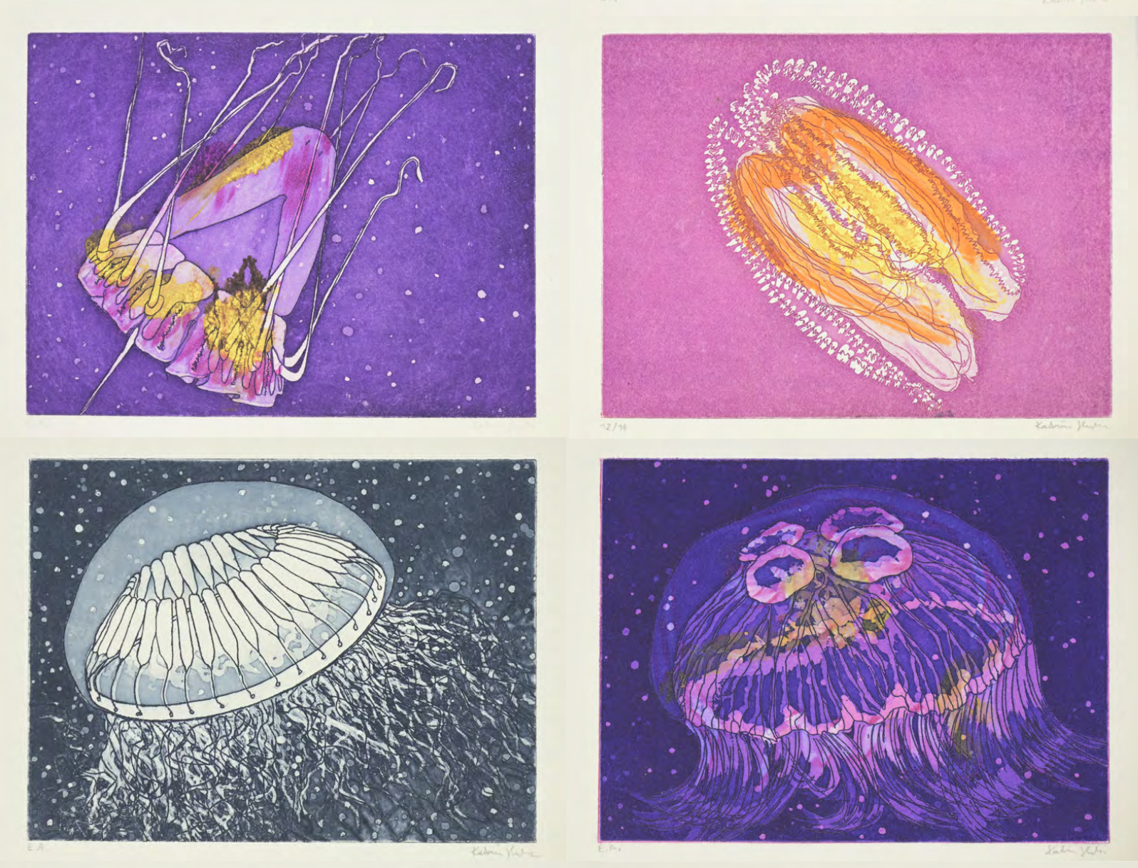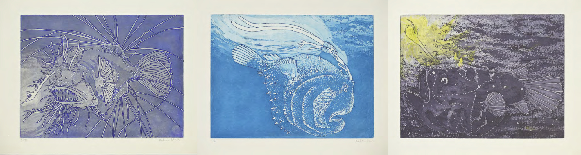 und ‘falsche Fische‘, 2024 Strichätzungen und Aquatinta auf Hahnemühle 230 g/m2, Grafische Werkstatt Salzburg |