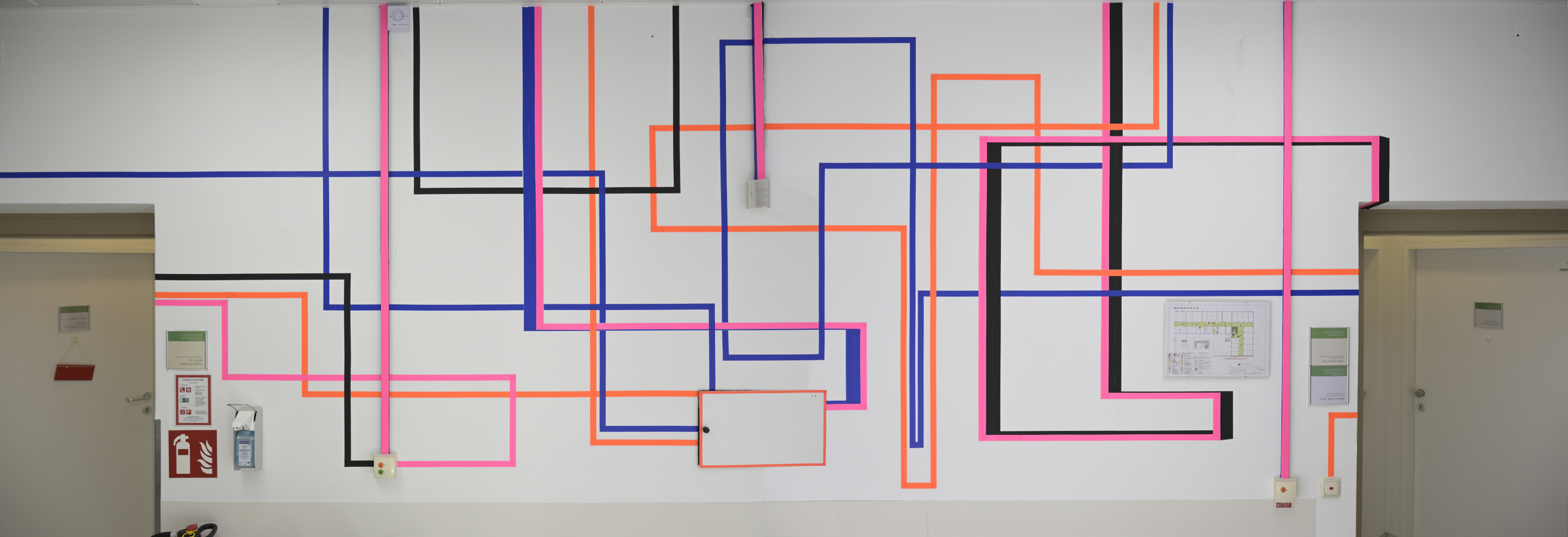 Fluchtplan, 2024 In Situ Arbeit im LKH Salzburg im Zuge der Ausstellung ‘Auf zu neuen Ufern!‘, Tapes, ca. 400 x 170 cm | |