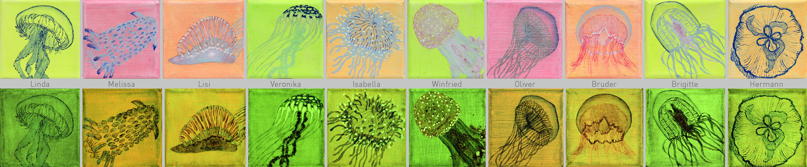 10teilige Serie “keine Fische”, 2023 je 10x10 cm, Acryl und Nachleuchtfarbe auf Leinwand |