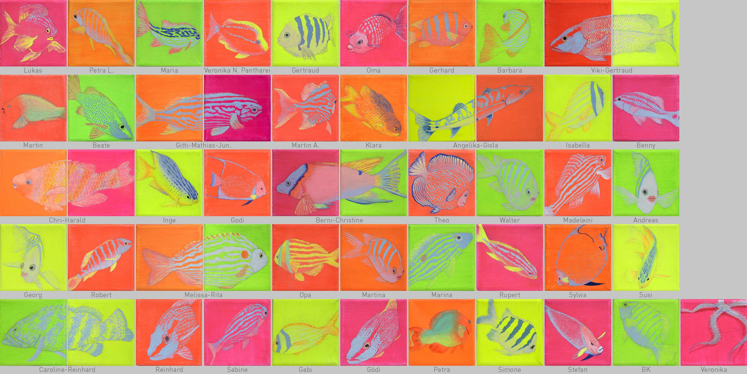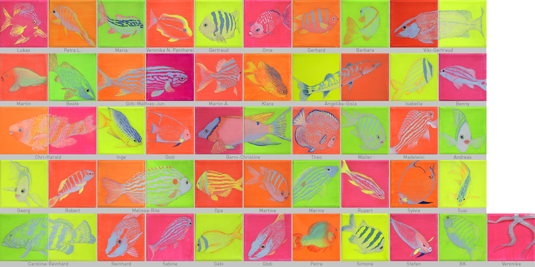 51teilige Serie “kleine Fische”, 2023 je 10x10 cm, Acryl auf Leinwand |