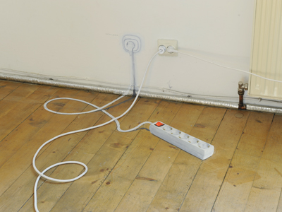 rauminstallation‘mehrfachstecker‘ 2009 Wand / Bodenmalerei, Laserpointer, Kabel, Steckdose, Stecker |